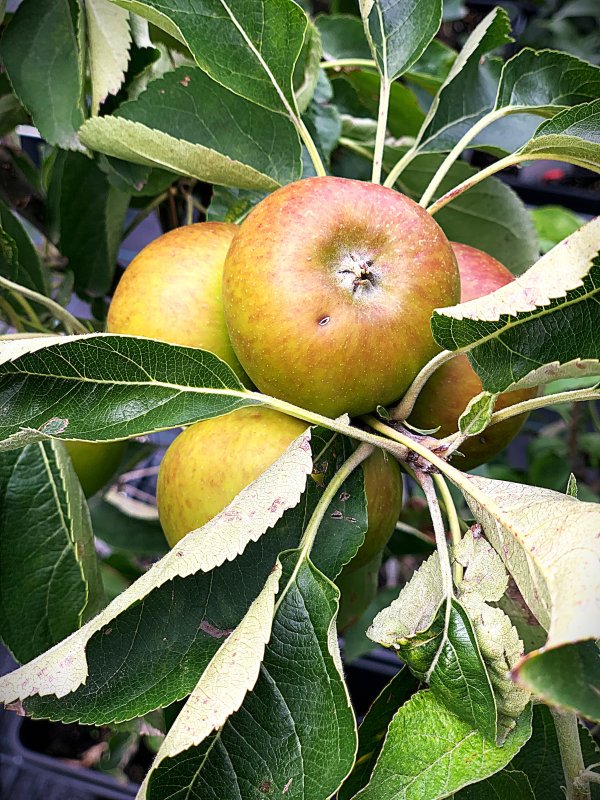 Zimní odrůda sloupovité jabloně s velkými červenými plody. V kontejneru