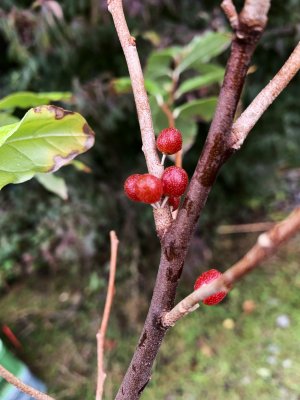 Eleagnus umbellata (hlošina okoličnatá) je okrasný i užitkový keř nesoucí jedlé červené plody. V kontejneru