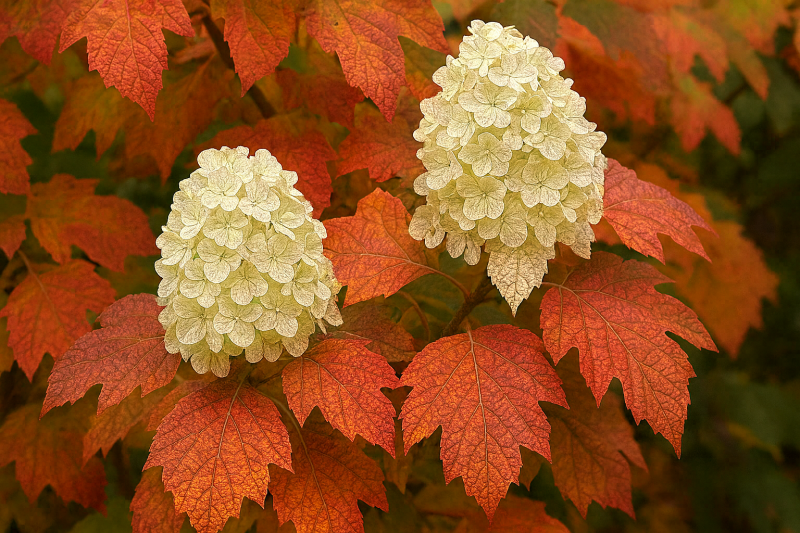 Hortenzie dubolistá s bílými velkými květy, které později zrůžoví a listy dubovými, na podzim vínově červenými až bronzově hnědými