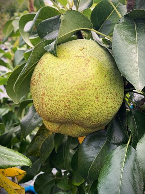 Podzimní žlutá odrůda hrušní zakrslého růstu, v kontejneru