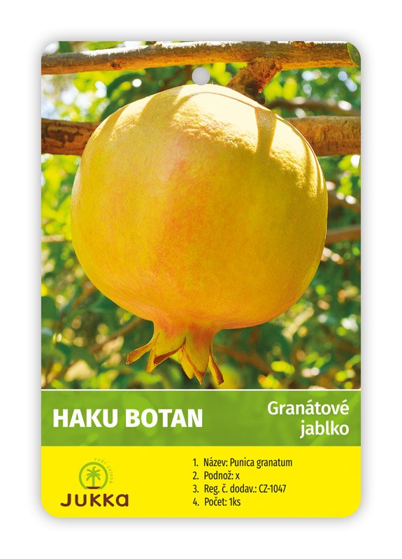 Granátové jablko Haku Botan pochází z Japonska, kvete nádhernými bílými květy které vzhledem připomínají květy pivoňky, vytváří kompaktní keř, je vhodný i do nádob. Kvete v průběhu léta (od června do srpna). Plody jsou středně velké, kulovité, krémově žluté až růžové se sladkou, aromatickou dužinou, jádra plodů jsou světlá. Jsou také považovány za skutečnou superpotravinu - semena a okolní dužina jsou bohaté na vitamín C, vápník, draslík, železo a antioxidanty. Dorůstá výšky 1 - 2 m a šířky 2 m. Odrůda má lesklé, tmavě zelené listy. Vyžaduje slunné stanoviště a dobře propustnou, úrodnou půdu. Samosprašná, odolná mrazu do -14 °C. V zimě potřebuje vegetační klid: maximálně 6 °C, minimálně -10 °C, musí shodit listy, aby zarodilo.