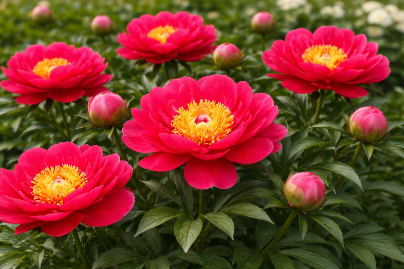 Paeonia lactiflora (Pivoňka čínská, lékařská). Květy miskovité, karmínově červené, s výraznými zlatožlutými tyčinkami uprostřed