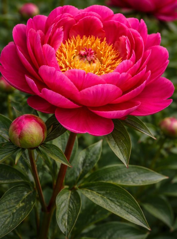 Paeonia lactiflora (Pivoňka čínská, lékařská). Květ tmavě růžový se žlutým středem, plný. Kontejner C2
