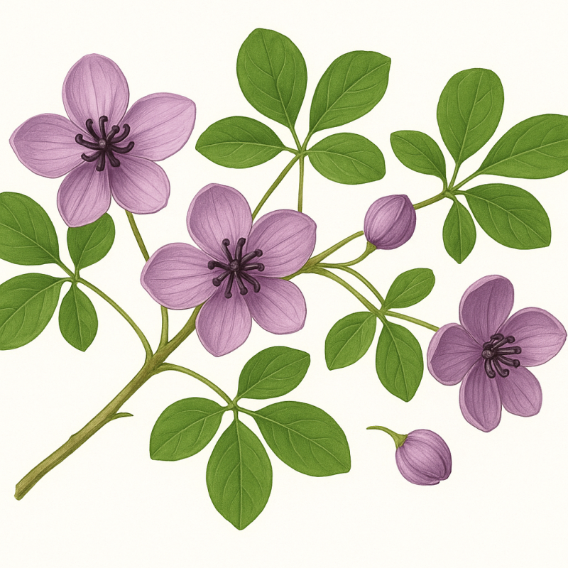 Akébie pětičetná je rychle rostoucí popínavá dřevina původem z východní Asie, konkrétně z Japonska, Koreje a Číny. Patří do čeledi čajovníkovitých (Lardizabalaceae) a je známá svými dekorativními listy, nezvyklými květy a zajímavými plody. Listy jsou stálezelené nebo částečně opadavé, složené z pěti oválných lístků, tmavě zelené a lesklé, což rostlině dodává elegantní vzhled. Květy jsou malé, fialové nebo purpurové s jemnou sladkou vůní a objevují se na jaře. Jsou výrazným dekorativním prvkem a přitahují opylovače, zejména včely a motýly. Na podzim rostlina vytváří podlouhlé, fialově zbarvené tobolky, které po dozrání praskají a odhalují sladkou, dužinatou, jedlou dužinu. Plody mohou být použity i k přípravě dezertů nebo ke konzumaci čerstvé. Dorůstá do výšky 8 - 10 metrů a šíří se pomocí rychle rostoucích výhonků, díky čemuž dobře obrůstá pergoly, ploty, treláže a stěny budov. Preferuje polostín, ale dobře snáší i slunná místa. Je odolná rostlina, která vyžaduje jen minimální péči. Mladé rostliny je vhodné podepírat nebo vést, starší rostliny lze stříhat pro kontrolu růstu a tvaru.