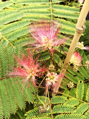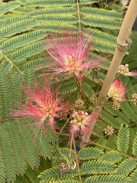 Albízia julibrissin, okrasná dřevina s růžovým kulovitým květenstvím s nápadnými tyčinkami