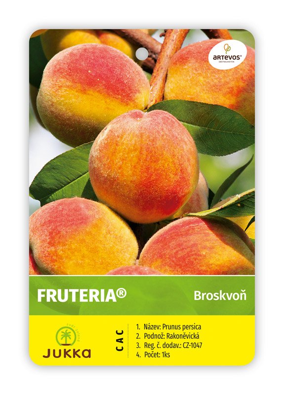 Broskvoň Fruteria je středně raná odrůda. Kvete pozdně, od poloviny do konce března, je samosprašná. Plody jsou středně velké, vejčité. Základní barva plodu je žlutá s převážně červeným překrytím. Dužina broskvoně Fruteria je bělavá, dobře odlučitelná, se sladkou broskvovou chutí. Dozrává koncem července až začátkem srpna, před odrůdou Redhaven. Roste středně silně, má vzpřímené větve, střední až vysoké výnosy. Odrůda je vysoce odolná proti kadeřavosti broskvoní a má celkově dobrý zdravotní stav.
