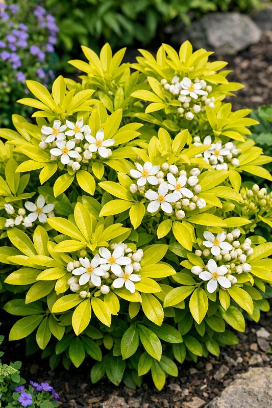Stálezelený silný kompaktní hustý keř s nápadnými bílými květy ve tvaru hvězdy