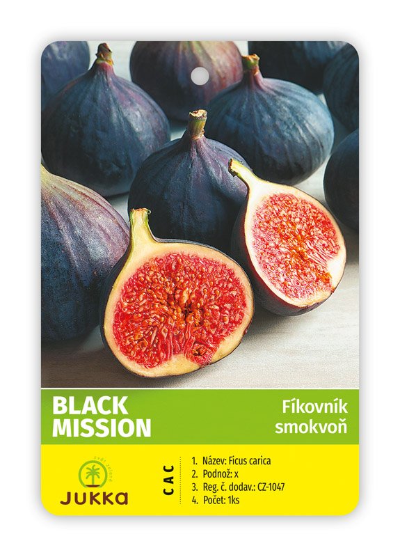 Fíkovník Black Mission je původem ze Španělska, jedna z nejčastěji pěstovaných odrůd. Plody jsou atraktivně zbarveny, velké až 70 g, ročně vytváří dvě sklizně. Dozrává během pozdního léta a brzy na podzim. Odrůda je nenáročná na půdu a pěstování. Dorůstá výšky 3 - 4 m. Upřednostňuje slunné stanoviště, dobře propustnou zahradní půdu. Asi do tří let věku rostliny (než takzvaně uzraje dřevo) je dobré ji pěstovat v květináči, na zimu ho přenést na bezmrazé místo. 5 - 10 litrový kontejner naplňte zahradnickým substrátem s 10 % písku. Když opadají listy, přesaďte do větší nádoby, 15 i 30 litrové. Očekávejte větší růst a i plodnost se dostaví brzy, asi po dvou letech. Když kmínek zesílí na průměr 6 - 7 cm, lze jej přesadit ven a nechat ho celoročně na zahradě. Plody fíkovníku se objeví aniž bychom je viděli kvést! Od září do začátku října sklízíme sladké červenohnědé až fialovočerné plody, které obsahují rozpustnou vlákninu, sacharidy, flavonoidy, polyfenoly, fytonutrienty. Dále draslík, hořčík, vápník, karotenoidy, vitaminy řady B a vitamin K. Čerstvé konzumujeme samostatně, přidáváme do ovocných salátů, sušené pak do müsli směsí a ovesných vloček.