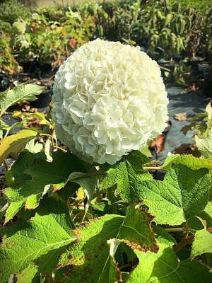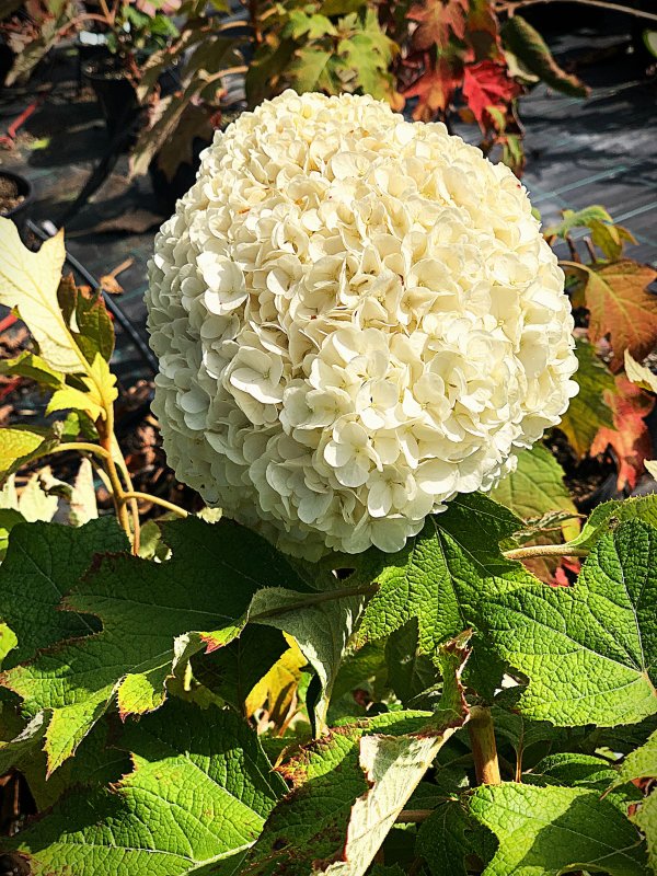 Hortenzie dubolistá menšího vzrůstu s velkými hustými bílozelenými květy a listy dubovými, na podzim vínově červenými až bronzově hnědými