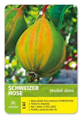 Schweizer hose je zimní odrůda hrušně s atraktivními pruhovanými plody. Sklízí se začátkem září, konzumní jsou od začátku října, skladovat je lze cca do ledna. Plody jsou středně velké se žlutými a zelenými pruhy. Dužina je máslovitá, šťavnatá, výborná. Plody vhodné k přímému konzumu, ke konzervaci i k destilaci. Vhodnými opylovači jsou například odrůdy Williamsova, Konference, Clappova.