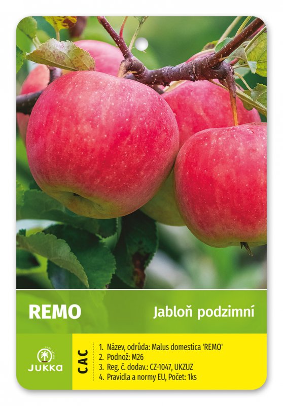 Jabloň Remo je podzimní odrůda vyšlechtěná jako kříženec odrůd James Grieve a BX 44.14, její domovina je Pomologický ústav Drážďany - Pillnitz, registrována od roku 1990. Strom roste středně bujně a tvoří rozložité koruny. Plody jsou středně velké až velké, kulovitě kuželovitého tvaru, žlutozelené barvy překryté vínově červeným líčkem. Dužina je krémová, sladkokyselá, křupavá a šťavnatá. Plodnost je brzká, velká, pravidelná. Sklízí se začátkem září, konzumní zralost začíná během září a vydrží do října. Odrůda je rezistentní a odolná mrazu. Vhodná pro pěstování ve všech oblastech, nenáročná.