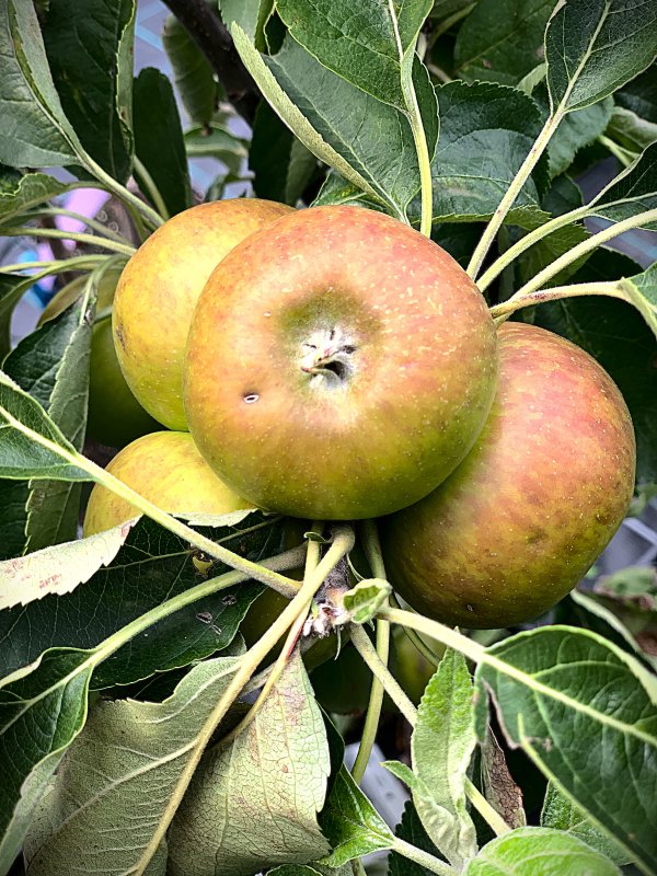 Zimní odrůda sloupovité jabloně s velkými červenými plody. V kontejneru