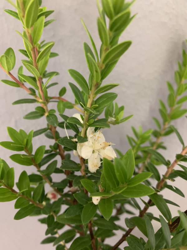 Myrta obecná je stálezelený keř s lesklými tuhými špičatými listy a bělavými květy s nápadným množstvím tyčinek.