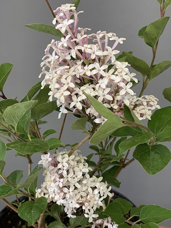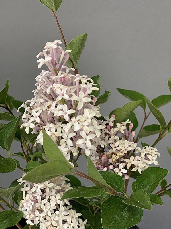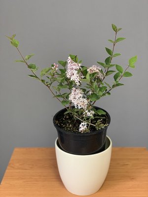 Zakrslá odrůda šeříku s narůžovělými poupaty a sněhově bílými květy, vhodná i k pěstování v nádobě