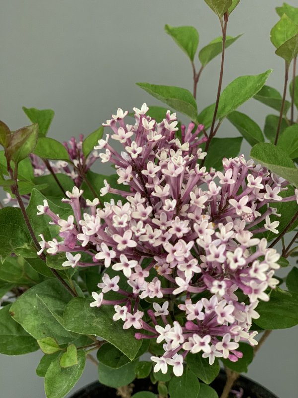 Kompaktní hustě rostoucí šeřík se sytě purpurovými poupaty a jemně lila růžovými květy